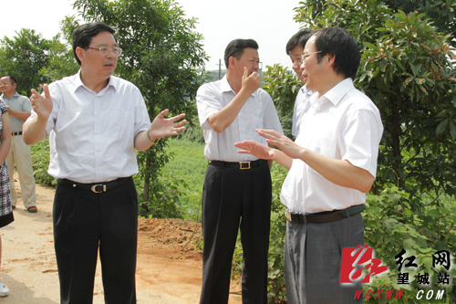 7月7日,袁观清(左一)一行在望城区委书记谭小平(右一)的陪同下来乔口镇踏勘了湖南省水产品一级批发市场的项目拟建地。解巾英 摄