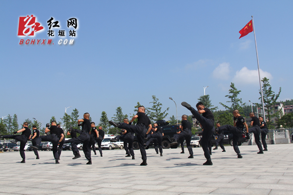 活动在花垣县公安局大院举行,两支队伍先后表演了队列练习、擒拿格斗、警械使用、反恐、突发情况实战处置等科目。