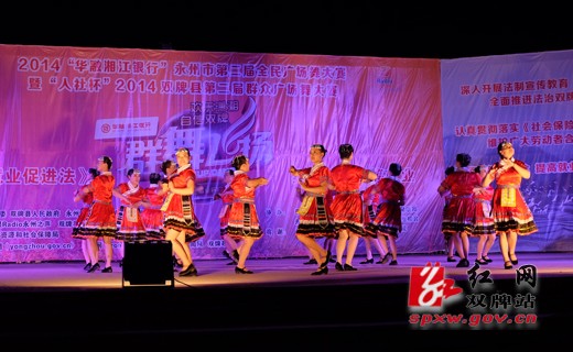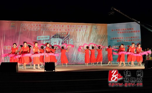 红网双牌站7月9日讯(通讯员 何恒)7月8日晚,双牌县滨江广场上洋溢着欢快热闹的气氛,一场贴近百姓生活,贴近群众实际的“欢乐潇湘·自信双牌”大型群众广场舞比赛正在上演。比赛在《追着幸福向前追》《中华全家福》中拉开序幕。全县共有15支参赛队伍登台竞技,展现健康活力。选手们响亮的口号、灿烂的笑容、优美的舞姿感染了现场的观众,观众们不时为参赛队伍的精彩表演热烈鼓掌,甚至情不自禁的随着节奏摇摆身体,整个广场变成了欢乐的海洋,充分显示了广场舞蹈大赛群体广泛参与性,反映了群众参与健身、乐于健身的高涨热情。经过激烈的角逐,双牌县文化馆风之舞队的《刘大娘笑呵呵》《辣椒歌》串烧征服了评委和全场观众,获得了本次比赛的一等奖,县教育局队、南岭队获得了二等奖,县人民医院队、茶林队、县财政局队获得了三等奖,良村队获得优秀组织奖,打鼓坪队获得了体育道德风尚奖。