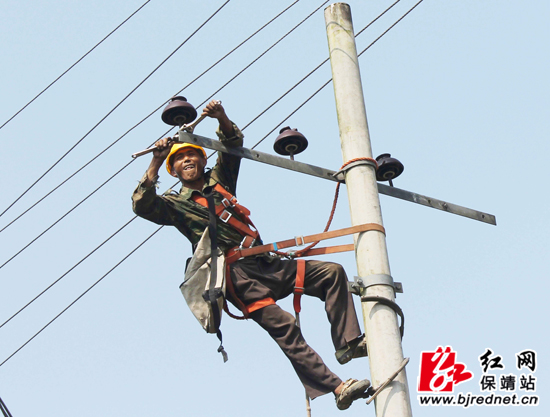 红网保靖站7月11日讯(特约通讯员 俞采华 通讯员 邹伟)7月9日,国网湖南省保靖县供电力公司的电力技术人员在比耳镇水坝村抢修线路。正值夏季用电高峰,该公司组织电力人员,深入全县各个乡镇检修电力设备,全面提高供电可靠性,满足群众夏季高峰期用电的需求。
