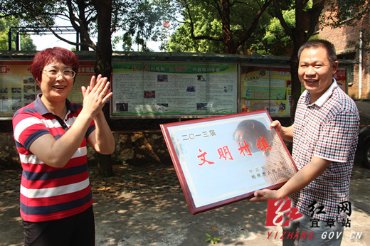 图为黄志莲为五岭乡颁发文明村镇荣誉牌