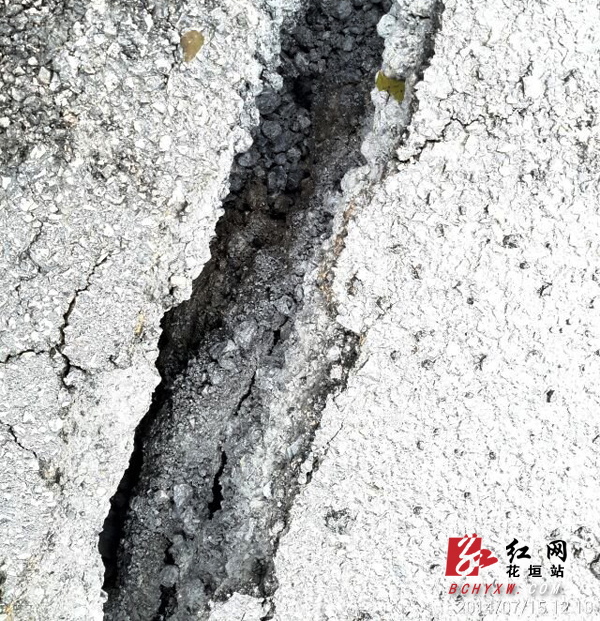 记者在现场看到,一半路面全部跨塌,长达三十多米。部分裂缝超过二十厘米,深度大约一米。