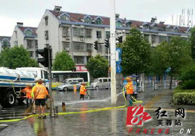 强化人机配合清洗。各环卫所抽调精干力量,安排36名清洗人员,配置12台小水车,分别在六条主干道开展人工协同机械清洗作业,确保路面无沉积泥沙。