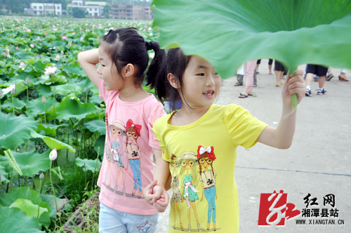 从莲农那“讨”来的荷叶当伞用,让双胞胎姐妹乐开了花。