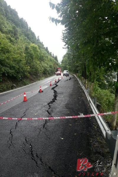 红网吉首站7月16日讯(通讯员 时晓慧)受连日大到暴雨影响,国道209桩号K2300+900米处,即吉首矮寨盘山公路三线,出现了大面积路基沉陷、路面开裂,给过往车辆行人带来了极大的安全隐患。