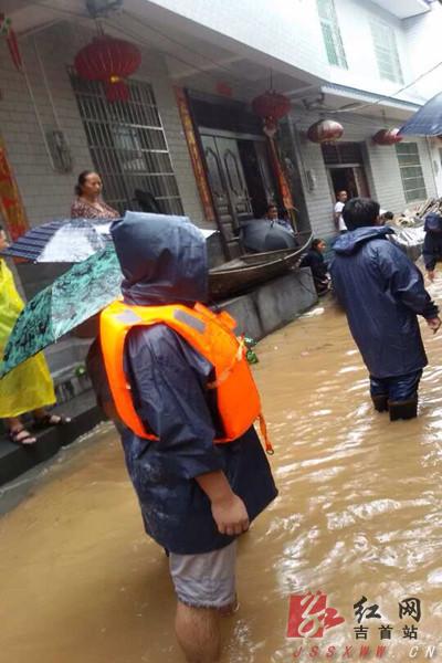 红网吉首站7月16日讯(分站记者 陈生真 实习生 汤舒丹)7月15日上午11时1分,记者驱车来到吉首市河溪镇堤子口路段,但见公路上已淹了过膝深的水,大雨之中,该镇党委书记杨昌松,与20多名干部群众一道,用小木船,正在转移房屋已进水的受灾户。