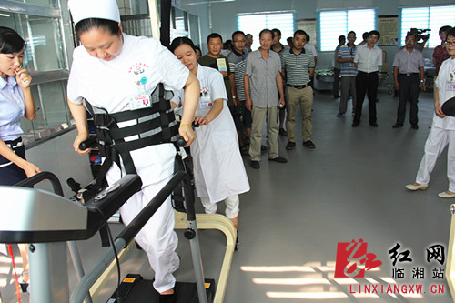 临湘市康复中心医师为参观人员演示康复设施使用方法