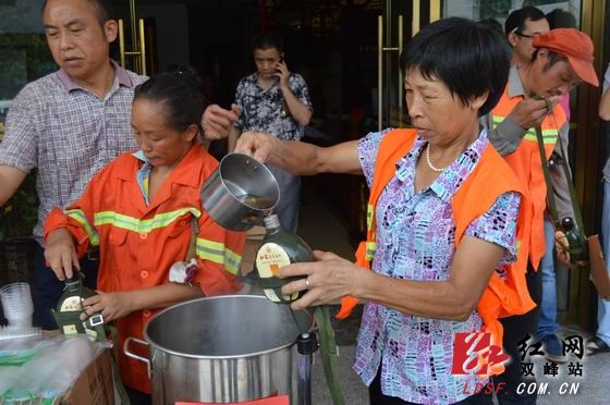 红网双峰站7月22日讯(通讯员 谢展南 王小华)7月21日,由爱心志愿者自发组织的“点滴关爱,温暖全城”活动正式启动。爱心志愿者逐一到双峰县城内各垃圾中转站为环卫工人赠送水壶和凉茶,同时为“免费茶水站”挂牌。活动由《湘中商情》主编曾冬梅发起。前不久的一天清晨5点多,街上基本没有行人和车辆流动。早起的曾冬梅见到一环卫工人正在清扫街道,于是,她便和这位环卫工人聊了起来,当她了解到这位城市美容师已经工作了1个多小时,非常感动。她为环卫工人连拍了几张工作照,发在微信和QQ空间,倡议有临街门店的爱心志愿者设立爱心加水站,免费为环卫工人和出租车、公交车司机提供凉茶。