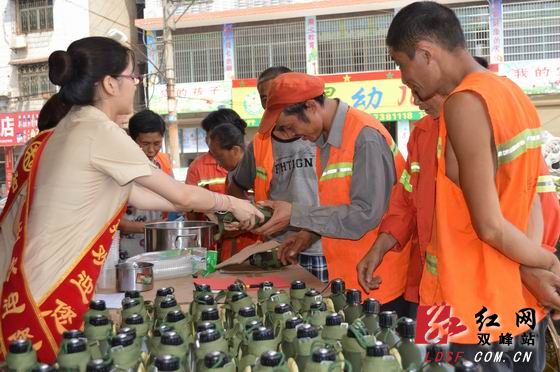 曾冬梅的倡议马上得到大家的响应,和莊商务会所、餐谋人生、新时代养生馆、日升电脑、广亚石材、泓廷大酒店、湘军府酒楼、皮阿诺橱柜、信达五菱车行、好喜爱购物广场等10家商铺老板踊跃报名,表示愿意在自家店铺设立爱心加水站,每天为环卫工人、出租车和公交车司机免费提供茶水,和莊商务会所总经理彭美任还为环卫工人免费赠送300多个军用水壶。