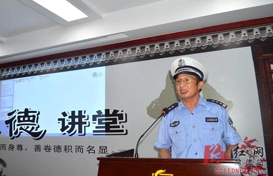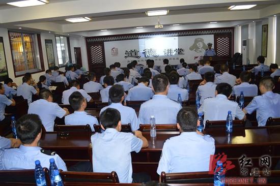 “常德,作为中国道德文化的发祥地,历来就有尊德、崇德、尚德的优良传统,在这里,有许多感人的故事值得我们去讲述、去聆听,也有着许多的道德模范,值得我们去学习敬仰……”在主持人政治处民警曹阳优美的讲叙中,本次道德讲堂活动于下午3时30分拉开帷幕,活动主题为“规范执法、奉献为民”,共分为“做反省、唱歌曲、学模范、诵经典、发善心、送吉祥”六个环节展开。
