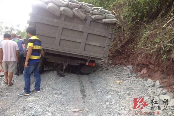 红网吉首站7月24日讯(通讯员 罗翼)7月24日上午8时,一辆载有25吨水泥货车在行至319国道河溪镇张排村红岩山段时,因车辆过重,路基再次塌陷,造成319国道河溪段再次中断。来源:红网
