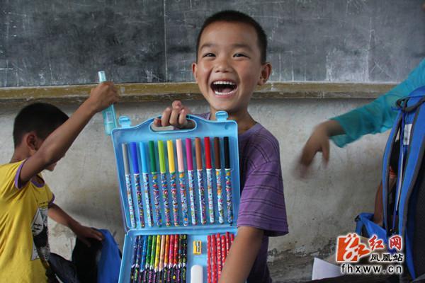 在千工坪乡建塘村,孩子们迫不及待地打开自己的“温暖包”。上小学五年级的张金玉一脸高兴地向记者展示着他的礼物,有书包、雨衣、T恤、手电筒、饭盒、水杯、水彩笔、花露水等15件物品,都是孩子们平时用得着的东西。他说:“我最喜欢这盒彩笔了,因为我喜欢画画,有这么多颜色我太喜欢了!谢谢叔叔阿姨们!”