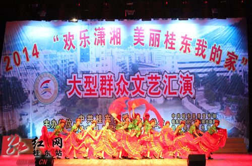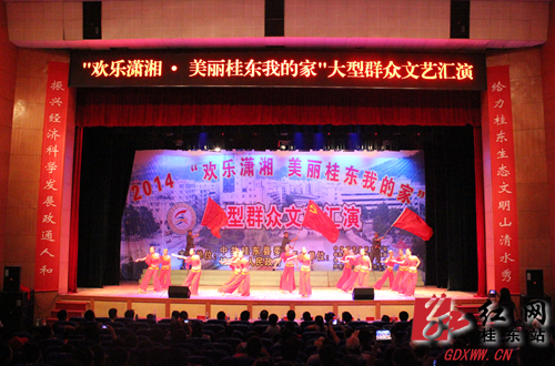 红网桂东站7月24日讯(分站记者 郭兰胜 通讯员 胡红英)7月22日,“欢乐潇湘-美丽桂东我的家”大型群众文艺汇演在桂东县影剧院隆重举行。来自全县各系统、各乡镇的280余名文艺骨干、精心排练了30余个精彩节目参加当天的演出。整场演出形式多样,内容丰富,异彩纷呈。既有富有本土文化气息的《卖饺子歌》、《真情一坛桂花酒》,又有结合党的群众路线教育实践活动,讴歌我县典型人物、事件的诗朗诵《追梦》和音乐剧《今生有梦终不悔》;既有民族风情的舞蹈《火凤凰》、《扎西德勒》,又有展示精湛技艺的乐器独奏《山丹丹花开红艳艳》、《竹楼情歌》;小合唱《我爱你中国》、歌伴舞《走进新时代》,展现了人们对党和祖国的无限赞美之情……