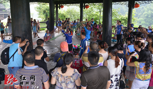 红网靖州站7月29日讯(分站记者 龙本亮 通讯员 耿有为)7月26日,是第二季《爸爸去哪儿》湖南靖州地笋苗寨之旅播出后的第二天,也是地笋苗寨旅游纳入商业运营的第一天,前来地笋苗寨旅游的游客络绎不绝。在当天300多的游客中,带着小孩的亲子游有三成之多。《爸爸去哪儿》剧中五个明星家庭住过的房屋成为他们观光的重点,看民俗表演,体验大小明星们参加过的爬竹竿、打木棍、骑高脚马,是他们乐于参加的节目。就连明星们穿过的衣服,很多家长、孩子也不放过,穿好,拍照,成为他们记忆中的永恒。饱了眼福、体验了古朴体育运动的乐趣,看了精彩的民族风情表演,接下来就是品尝苗家油茶和龙头宴、大饱口福时候了。地笋苗寨有接待能力的家庭每一户都客满,明星客房的预定已超出一周。《爸爸去哪儿》剧在地笋拍摄开播,带火地笋亲子旅游热,迎来地笋苗寨旅游的开门红。