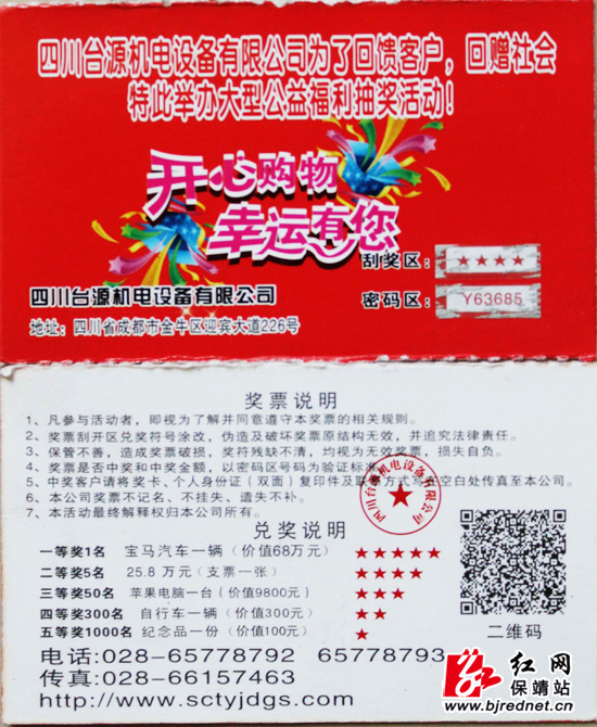 每张奖券上都有二维码,扫描后链接到一个名为四川台源机电有限公司的网站。网站制作看起来很正规,而且在捡到的出库单上的产品在该网站上都能找得到,并在网站的首页醒目位置贴有奖券上的幸运大抽奖活动,联系电话也都相互对应。