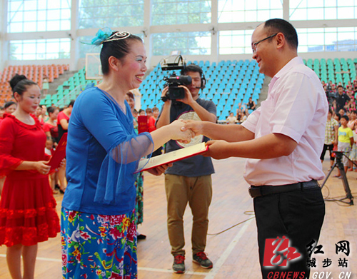 城步县委常委、宣传部长曾伟子为获得冠军的八角社区代表队颁奖