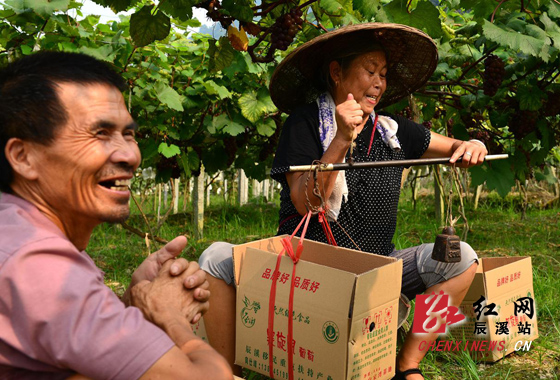 红网辰溪站8月4日讯(通讯员 彭本胜)8月3日上午,笔者在柿溪乡移民葡萄基地采访,恰遇向家湾村向仕军老两口在葡萄园摘葡萄,只见乌黑亮晶晶的“黑旋风”挂满架下。