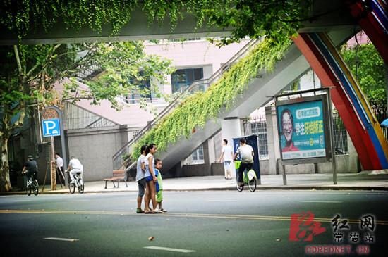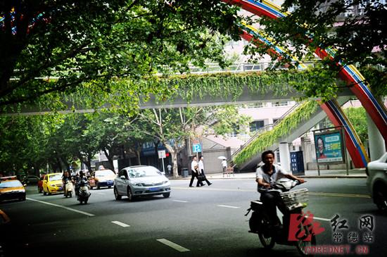 常德市一中路段,车流量较大,行人过马路不方便。应市民要求,政府修建了彩虹天桥,以减少此路段的交通安全隐患,保障学生们的生命安全。但是记者看到,直接穿行马路的市民比比皆是,使天桥为摆设。记者从上午10点20分开始,待了将近10分钟,在视线范围内,横穿马路的市民达20多个,记者也在天桥上守了10分钟,发现通过天桥穿行马路的市民却寥寥无几。