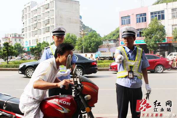 责令无牌无证闯红灯摩托车靠边接受检查。章澜/摄