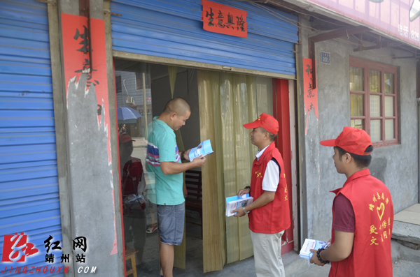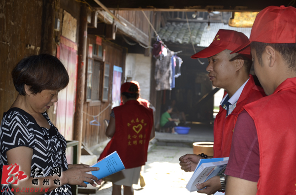 志愿者们正逐户发放宣传手册 龙沛 摄