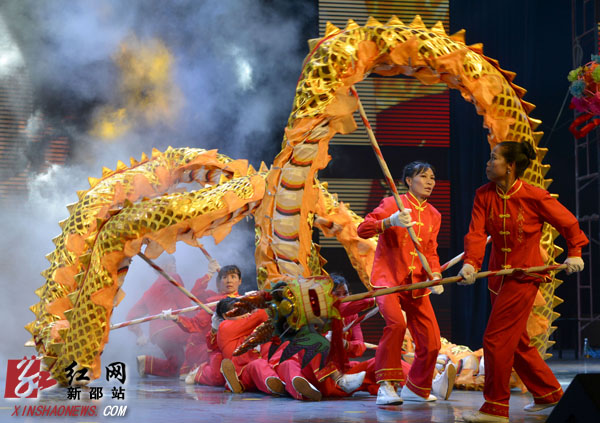 在这里进行的是“欢乐潇湘·魅力邵阳”新邵专场演出。90分钟时间,12个节目精彩纷呈。其中即有气势磅礴的鼓舞,又有优雅抒情的合唱,即有充满中国风的古筝表演,又有展示新邵元素的司马江号子。原创节目《姣龙飞腾》中,来自该县潭溪镇的女子舞龙队将传统舞龙节目搬上舞台,加上一些自创的高难度动作,观众在喝彩的同时纷纷感叹巾帼不让须眉。原创小戏《最后一公里》,以新邵不久之前发生的“5.25”抗洪抢险、灾后重建为题材,用其接地气的台词、幽默的唱腔、风趣的表演,掀起了现场的一个高潮。
