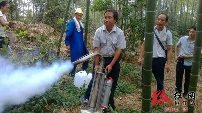 图为桃江县林业局专家在示范喷雾机使用方法