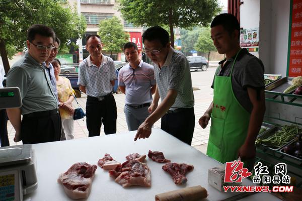 岳阳县委书记毛知兵(右二)察看一佳土猪产品