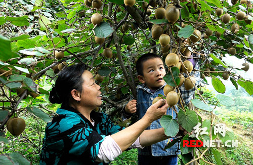 红网隆回8月18日讯(通讯员 贺上升)8月17日,湖南省隆回县小沙江镇湘禾猕猴桃开发专业合作社成员邹久花与孙子望着猕猴桃果压枝头喜上眉梢。该社在本镇和外市县建立生产示范基地,以“公司+基地+农户”形式,发展“翠玉”、“龙藏红”等优质猕猴桃品种1万多亩,形成产供销一体化产业经营,社员种植不愁销。