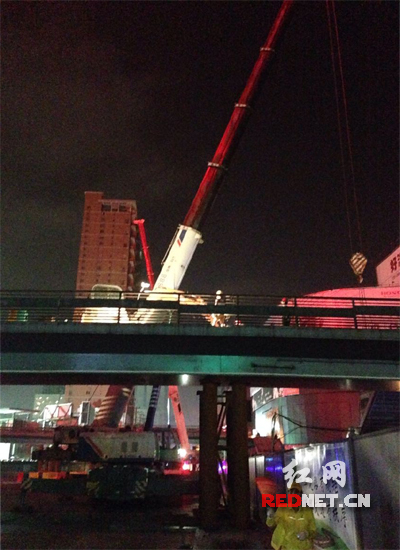 (8月20日凌晨,施工人员正在对长沙司门口人行过街天桥拆除。)