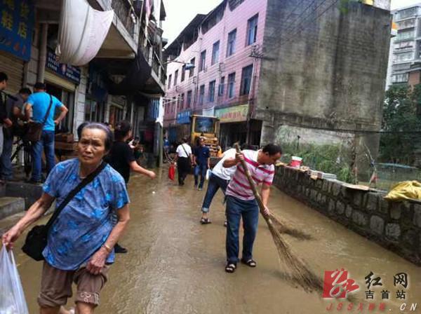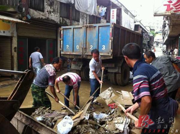 在抗洪工作结束后,峒河街道马上转入救灾工作,组织两个社区党员、干部40余人,在执法、环卫部门的支持下,清扫淤泥、垃圾,疏通道路,整治光明桥下市场。