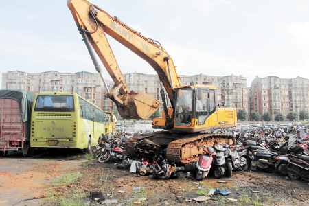 昨日上午,在岳麓区施救站停车场,一排排的电动车和二轮摩托车被挖机当场捣毁后装入大货车,工作人员站在车厢上用水带对车辆的残体进行冲洗,防止泄漏的燃油带来安全隐患。