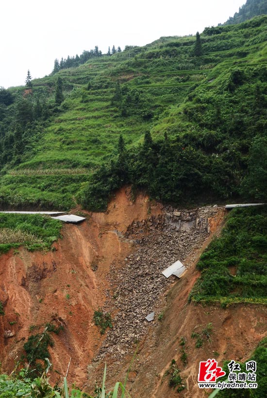 红网保靖站8月22日讯(通讯员 向万银)8月18日,无情暴雨袭来,省道保靖(迁陵)至古丈(默戎)葫芦镇木芽村辖区路段塌方,造成车辆、行人无法通行。木芽村村民龙支信、龙发坤、龙宇、龙珠全、石桥莲等自发组织起来,拿起了砍刀、锄头在公路塌方的上方修起了一条长约20米的山路,方便了过往群众通行。来源:红网