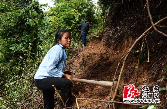 8月19日,木芽村民石桥莲等村民在挖人行通道
