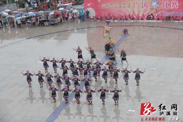 尽管天空下起了雨,但是丝毫没有影响参赛者们的热情,《湘西玛汝玛》、《今日苗山歌最多》、《湘西酒歌》、《喜洋洋》、《土家年》和《摆手吧里吧》,等一支支舞蹈精彩上演,参赛者们还在表演中别出心载的加上鼓舞、傩面舞、摆手舞等具有民族特色的表演形式。观众们也纷纷撑起雨伞,为表演者们呐喊助威,五彩的雨伞围起的圆环和在其中灵动的舞者,让整个比赛现场看起来像一朵盛放的花朵。