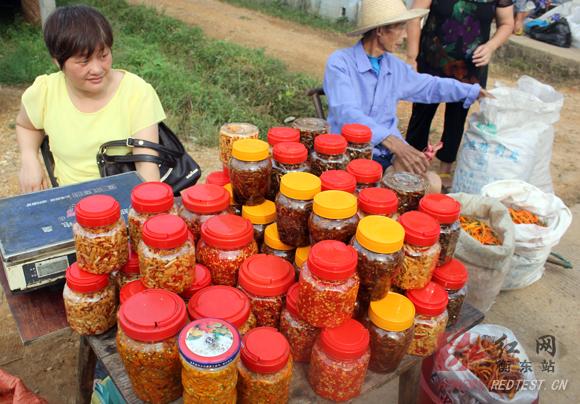农户在田埂上摆摊售卖自制的黄贡椒产品