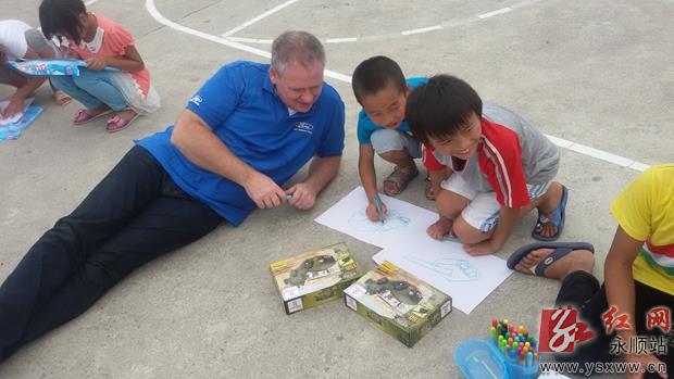 图为福特汽车工程研究(南京)有限公司经理Timothy James Cleary看同学们画画