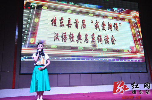 晚7时30分,诵读会在县舞蹈协会百花少儿艺术团表演的《练字谣》中正式拉开序幕,随后,来自全县相关部门、学校、协会的数十名诵读爱好者先后诵读了《春晓》、《那时你老了》、《世界上最远的距离》、《七律长征》、《再别康桥》、《面朝大海,春暖花开》、《离家》、《沁园春·雪》、《人间四月天》、《相信未来》、《桂东赋》、《乡愁》、《中华少年梦》、《致橡树》、《出师表》、《总有一天,我变成一棵树》、《玲珑茶赋》等20余首经典诗歌。感人至深的诗句,亲切唯美的背景音乐,加上诵读爱好者字正腔圆地吐字,深情款款地表演,无不振撼台下观众的心灵,引得台下一阵阵热烈掌声。