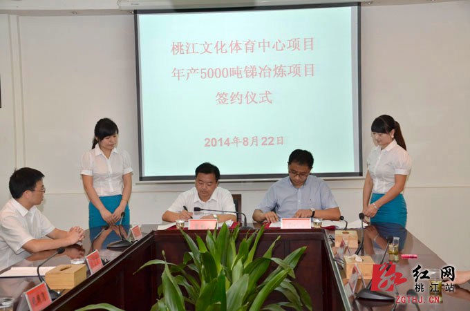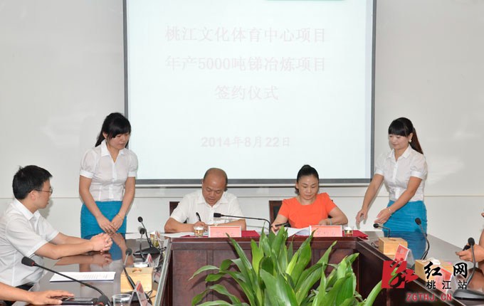 副县长王军华代表桃江县人民政府与湖南省加嘉锑业科技有限公司签订了年产5000吨三氧化二锑及含砷废物有价金属综合回收利用项目投资协议书。该项目选址位于牛田镇金光山村,用地面积约120亩,项目总投资2亿元,项目分两期进行,第一期投资完成固定资产投资1亿元,第二期完成固定资产投资2000万元。
