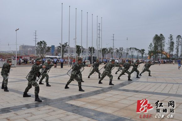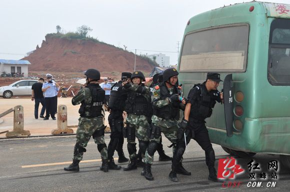 双峰县委副书记李铁雄,县委常委、政法委书记黄为,副县长、县公安局局长刘道光观摩演练。县委宣传部、县公安局、县公安局巡特警大队、县消防大队、武警驻双中队、县人武部民兵应急分队、县电力抢险应急分队、县医疗救护队、县住建局供水设施抢修分队、县民政局应急救援分队、县环境保护局环境监测大队、县体育局、县公安局交警大队、省运安保执勤分队等14支应急处突力量参加反恐演练。