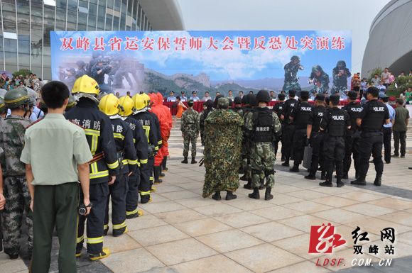 红网双峰站8月27日讯(分站记者 朱延寿) 8月26日,2014年省运安保誓师大会暨反恐处突演练在双峰县体育中心举行,以切实提高各应急处突力量应对恐怖袭击的快速反应能力,检验相关单位应急力量建设情况,全面加强反恐怖应急救援准备工作。
