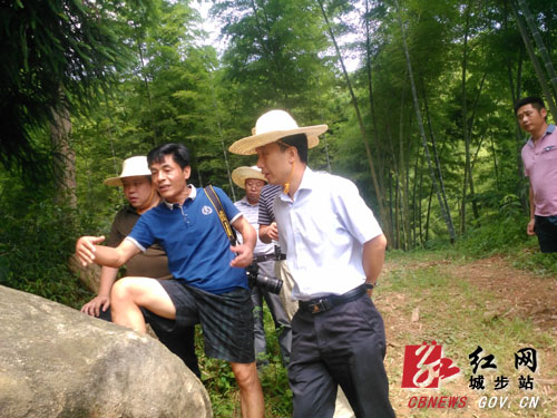 红网城步站8月27日讯(通讯员 雷承贵)8月23日,星期六,城步苗族自治县委副书记、县长杨博理在副县长陈小兵及县文广新局、文物局等单位负责人陪同下,前往离县城不远的丹口镇陡冲头村古苗文摩崖石刻群考古发掘现场进行调研。经过一个多小时的山路颠簸,调研组来到陡冲头村考古队驻地,杨博理代表县委政府对省考古所专家进行亲切慰问,并详细询问了他们的生活工作情况。随后,在湖南省考古队队长吴顺东教授的陪同下,杨博理一行沿山路绕陡冲头白竹山转了一圈,全面察看了整个考古挖掘现场。