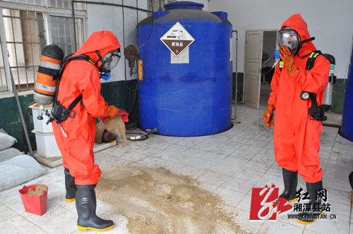 上述一幕,是昨天上午湘潭京湘供水有限责任公司安全消防救援演练的全过程。在市、县安监部门的全程参与、指导下,县消防大队、水厂各部门通力合作,成功将水厂起火、硫酸泄露、水质污染等“险情”排除。