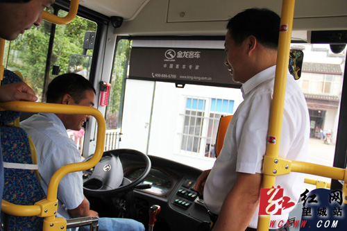 杨利成(右一)在靖港镇检查公交车消防安全设施配备。
