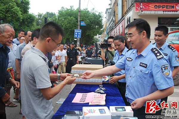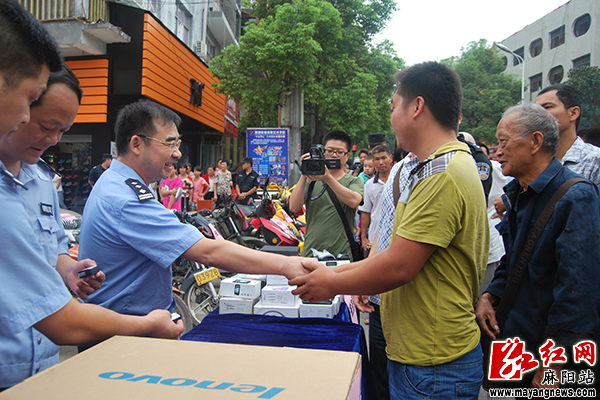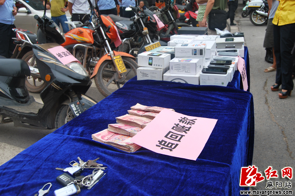 自“打击多发性侵财犯罪”专项行动等开展以来,麻阳县公安局高度重视,把打击多发性侵财犯罪作为回应人民群众对社会平安新期待的着力点、突破口,全警动员、全力以赴,打盗抢、抓现行、挖团伙、追逃犯,发起了凌厉攻势,破获了一批关系群众切身利益的侵财案件。在破案当中,民警高度重视追赃工作,千方百计追赃,尽最大努力挽回群众损失。此次退赃大会共向失主发还被盗的现金342500元、汽车3台、三轮摩托车5台、二轮摩托车15台、台式电脑8台,手机100余台,液晶电视2台,价值共计100余万元。