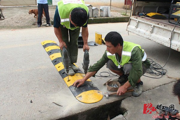 红网桃江站8月29日讯(分站记者 张琴)8月26日,由桃江县校车领导小组牵头、县教育局落实、县公安局交警大队具体组织圣安施工队进行施工,在全县学校周边道路安装减速板和提示标牌,作为确保学校学生安全的最大民生工程。