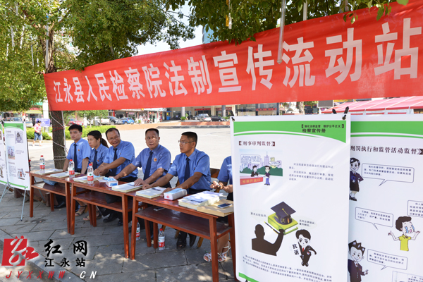 红网江永站9月1日讯(分站记者 游康生) 8月29日,县检察院从各科室抽调人员组建法制宣传流动站,开展法制宣传活动。当日,流动站在知青广场拉起宣传条幅,摆开办公桌椅,摆放普法宣传展板,以图文并茂、浅显易懂的方式,突出对民事行政审判监督、刑事审判监督、立案监督、审查逮捕等法制知识的宣传。检察干警还主动走进商家店铺发放《江永县人民检察院检务公开》和《检民联系卡》。