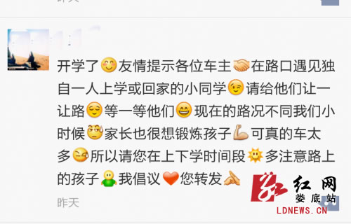 车太多了,小孩安全意识不强,真担心,一位妈妈在微信圈里发出了倡议,“开学了,友情提示各位车主,在路口遇见独自一人上学或回家的小同学,请给他们让一让路,等一等他们,现在的路况不同我们小时候,家长也很想锻炼孩子,可真的车太多,所以请您在上下学时间段,多注意路上的孩子,我倡议,您转发。”倡议一发出,转发率也是相当高,得到了不少父母的认可,有些还表示,要提倡少开车,搭乘公交车,绿色环保出行。