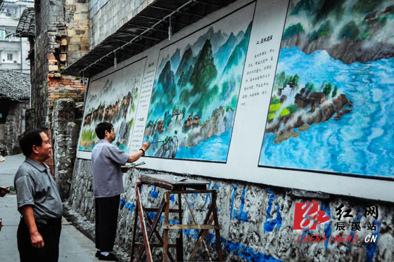 红网辰溪站9月2日讯(实习记者 张文竹) “酉山耸翠、辰水回澜……”9月2日,历时一个月创作的巨幅壁画——辰溪古八景图已绘制完成。