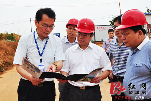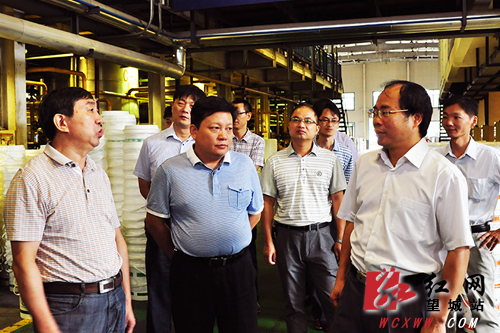 长沙市望城区委书记谭小平(前排右一)正在了解众城石化生产经营情况。高亮 摄
