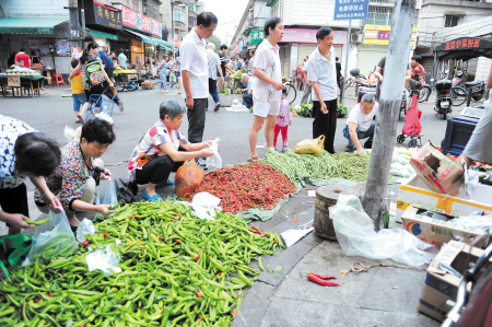 “快来看快来买,本地辣椒味美价廉……”沙湖桥街一路口的地面上,摆满了蔬菜,摊主不停地吆喝着。“我买两斤红辣椒吧”、“毛豆多少钱一斤啊”……早起的居民蹲在地上选着自己想要的菜。